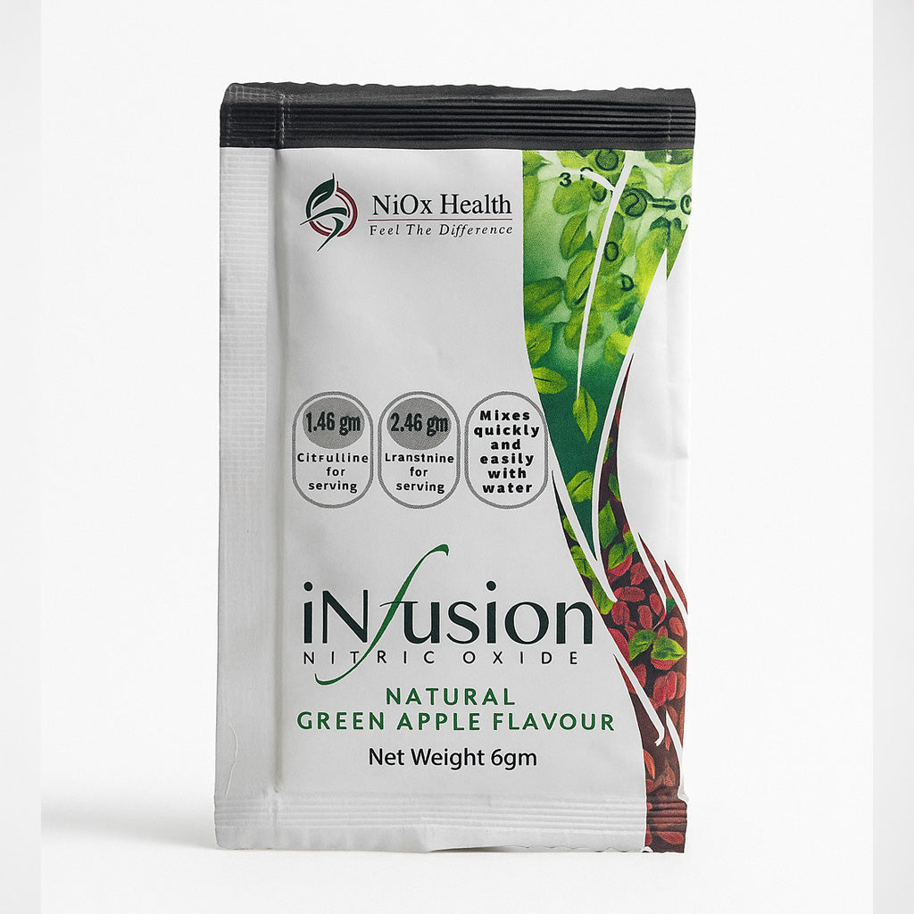 A: Each sachet contains 6 g of NiOx Infusion Green Apple — the same high-potency blend as our tub version, with L-Arginine, L-Citrulline DL-Malate, Thaumatin (natural sweetener), and natural flavouring.